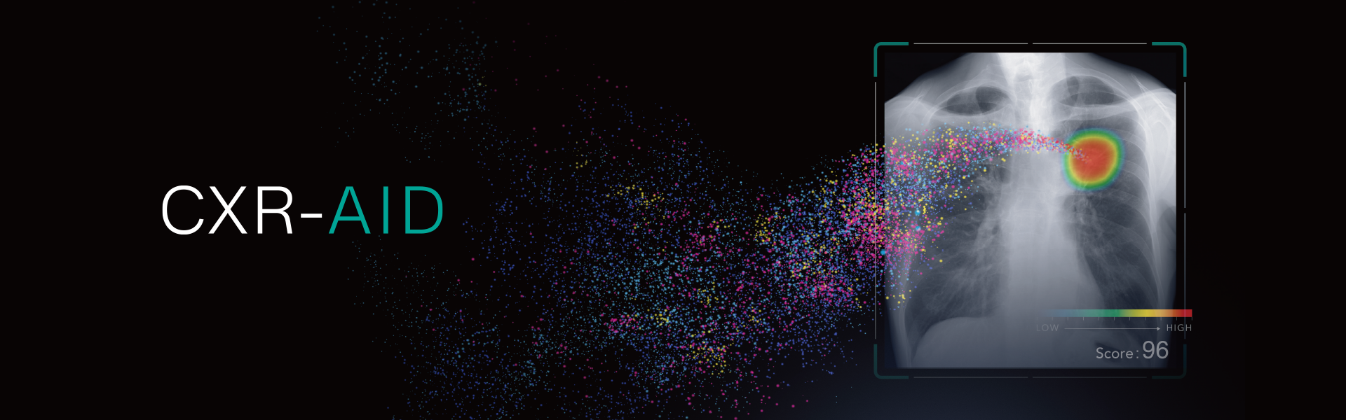 CXR-AIDは人工知能のAIを活用して、撮影された胸部レントゲン画像を数十秒のうちに自動解析して結節・浸潤影(肺癌、肺結核など)、浸潤影(肺炎)、気胸が疑われる領域を検出・マーキングして表示するシステムです。